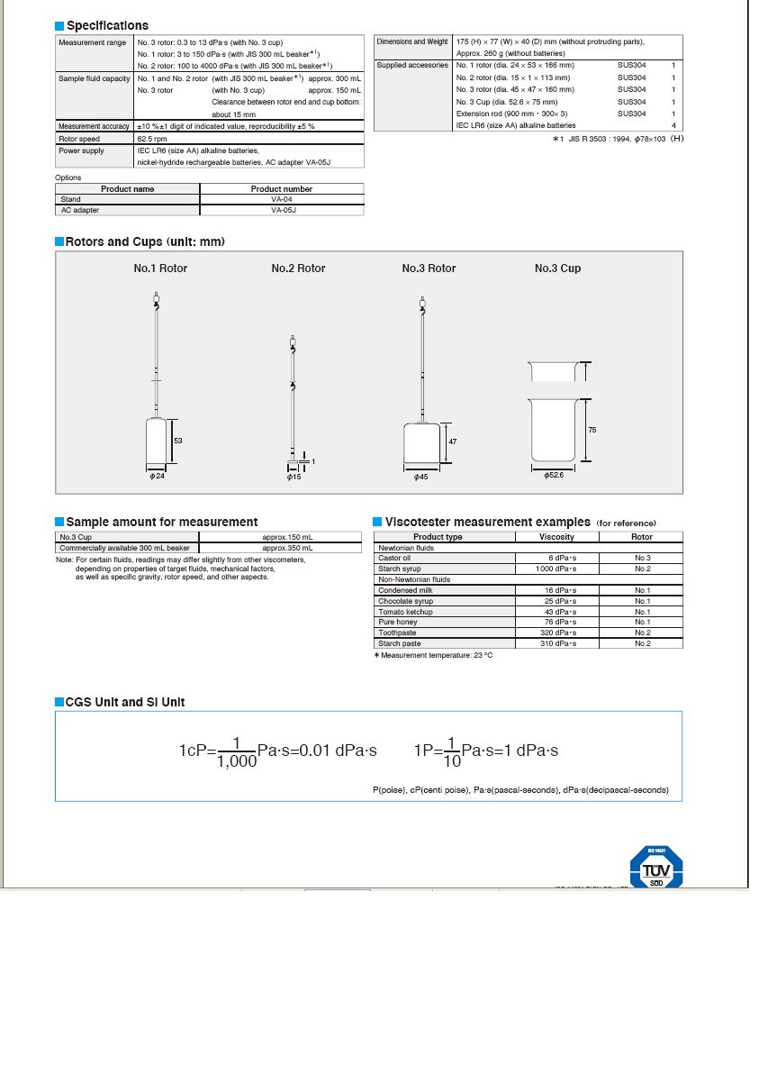 The VT is designed for quality control applications in the manufacturing process of industrial products such as petrochemicals, paint, and adhesives, as well as foodstuffs. Viscosity measurements covering a wide range are possible, such as gear oil used in construction machinery. Measurement is performed by simply submerging a rotor in the fluid. The resistance to rotor movement caused by the viscosity (torque) is measured to obtain direct readings.
