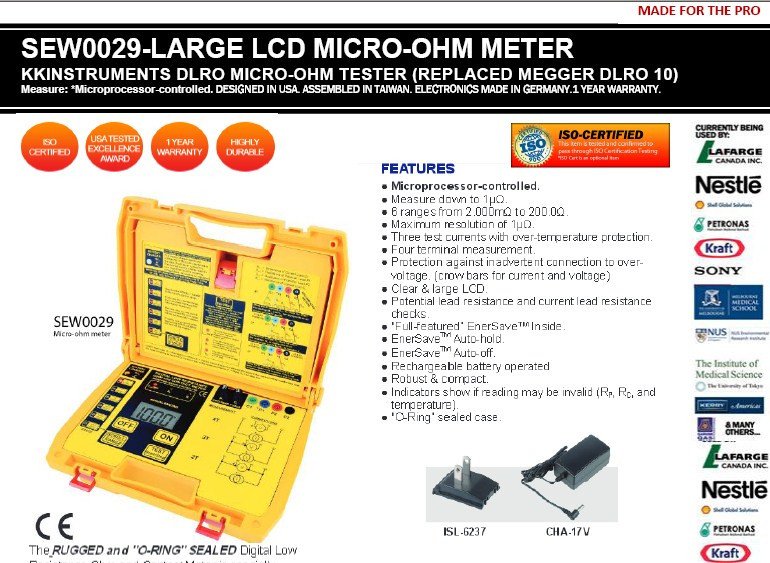 ● Microprocessor-controlled. ● Measure down to 1μΩ. ● 6 ranges from 2.000mΩ to 200.0Ω. ● Maximum resolution of 1μΩ. ● Three test currents with over-temperature protection. ● Four terminal measurement. ● Protection against inadvertent connection to over- voltage. (crow bars for current and voltage) ● Clear & large LCD. ● Potential lead resistance and current lead resistance checks. ● "Full-featured” EnerSave™ Inside. ● EnerSave™ Auto-hold. ● EnerSave™ Auto-off. ● Rechargeable battery operated ● Robust & compact. ● Indicators show if reading may be invalid (RP, RC, and temperature). ● "O-Ring” sealed case.