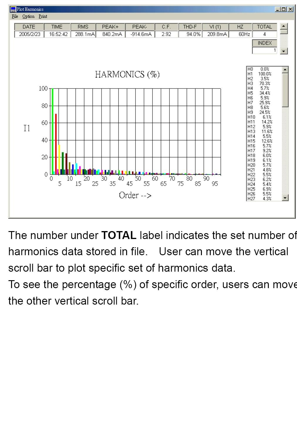 | Harmonics of AC Voltage in % and in Magnitude (1 to 99th order, minimum voltage at the 50 or 60 Hz>AC 80V) |